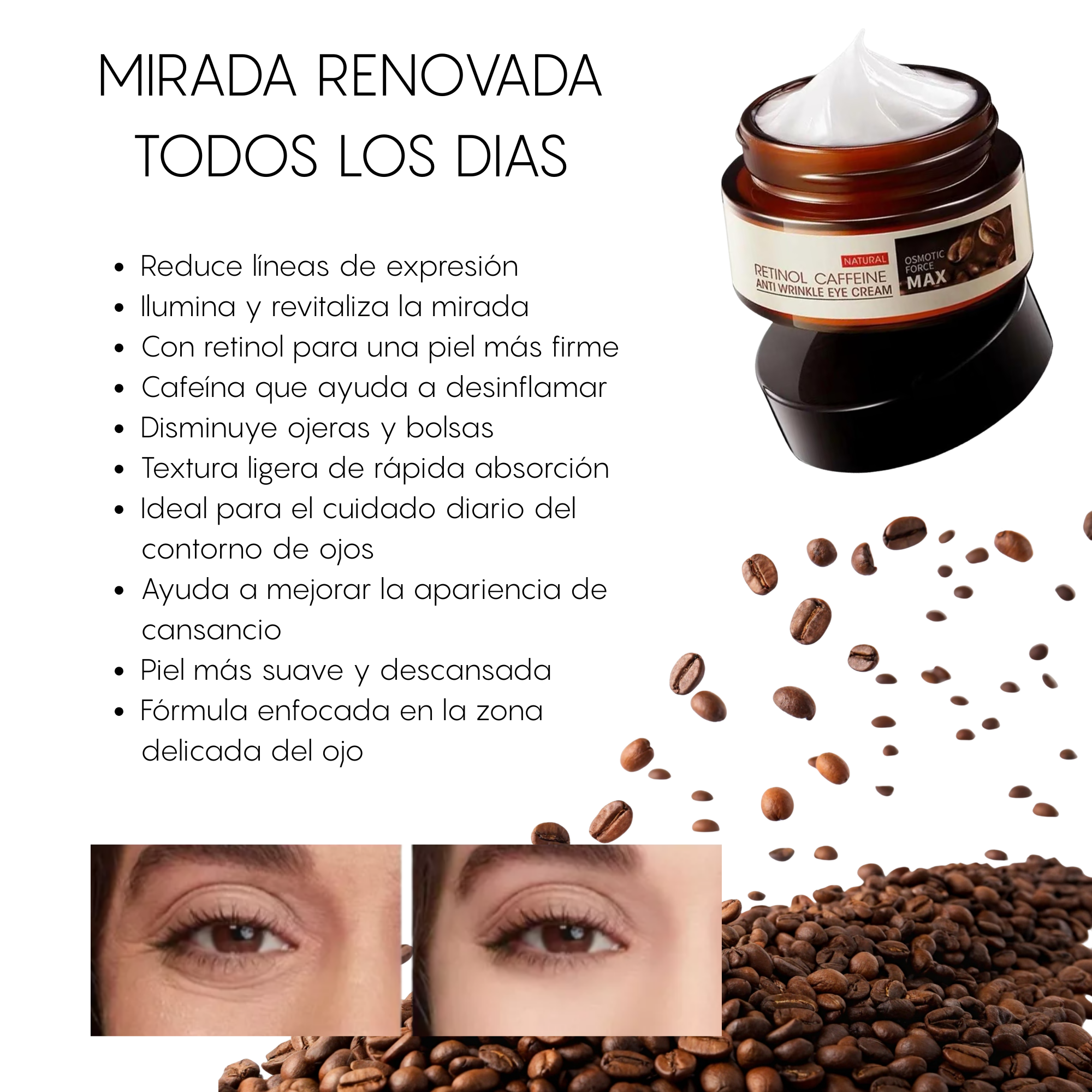 Combate las arrugas: El retinol ayuda a reducir visiblemente las arrugas y las líneas finas alrededor de los ojos.