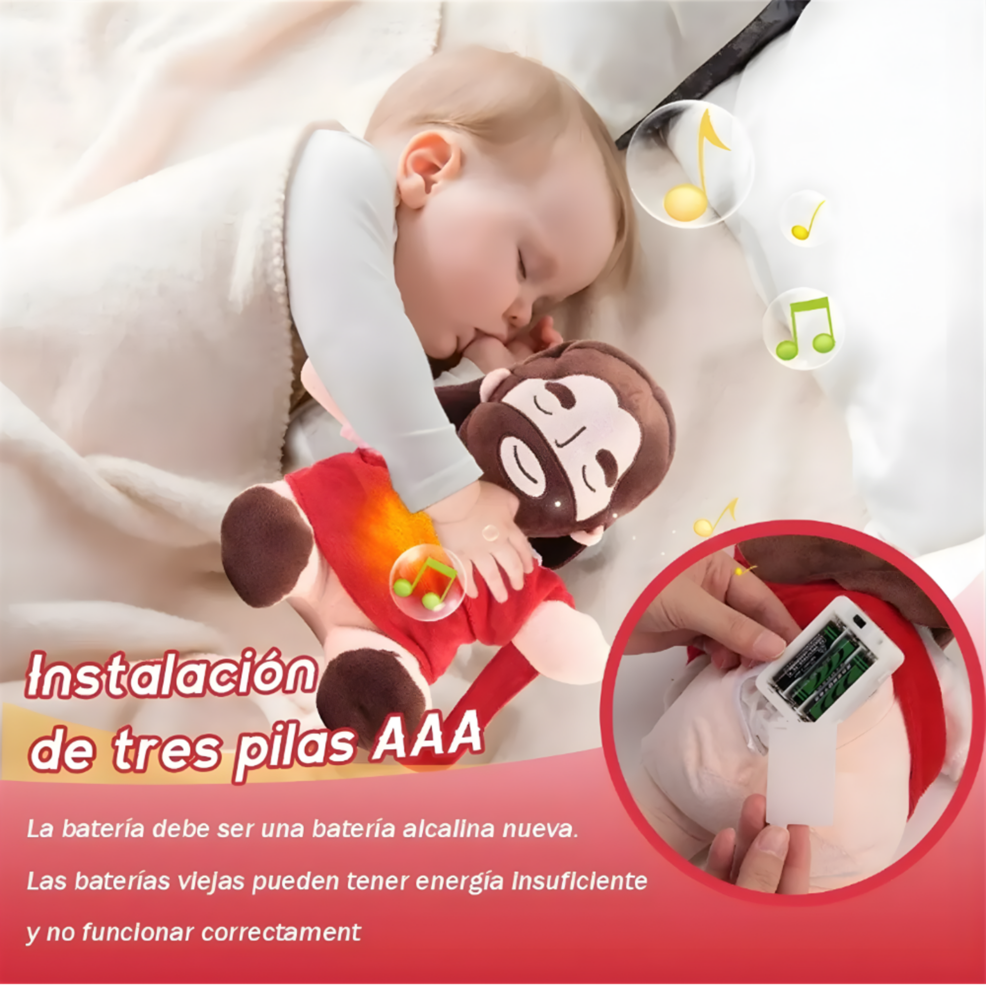 Configurar: Soothing Bear es muy sencillo. Simplemente encienda las baterías en la parte posterior, inserte 3 baterías AA y presione el símbolo musical en el pie izquierdo para escuchar melodías serenas.