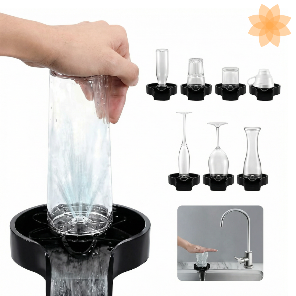 Este enjuagador de vidrio ofrece una limpieza potente en segundos. Solo coloca la taza boca abajo, presiona ligeramente y el sistema rocía agua a alta presión desde múltiples ángulos, eliminando eficazmente residuos y restos difíciles sin necesidad de tallar.