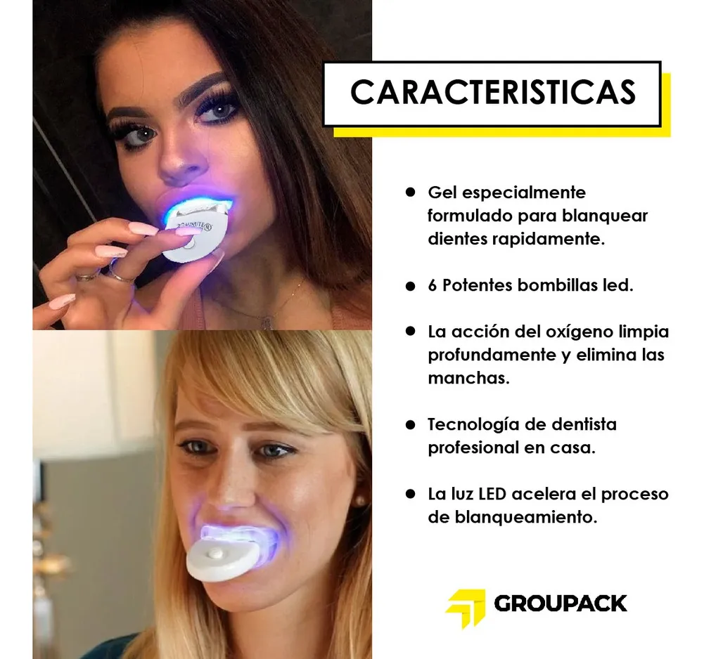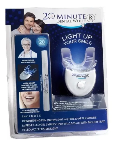 Incluye un bolígrafo blanqueador, bandeja de boca, luz LED y vitamina E. Las aplicaciones recomendadas son dos veces por semana, de 15 a 20 minutos, for una sonrisa más blanca y brillante.