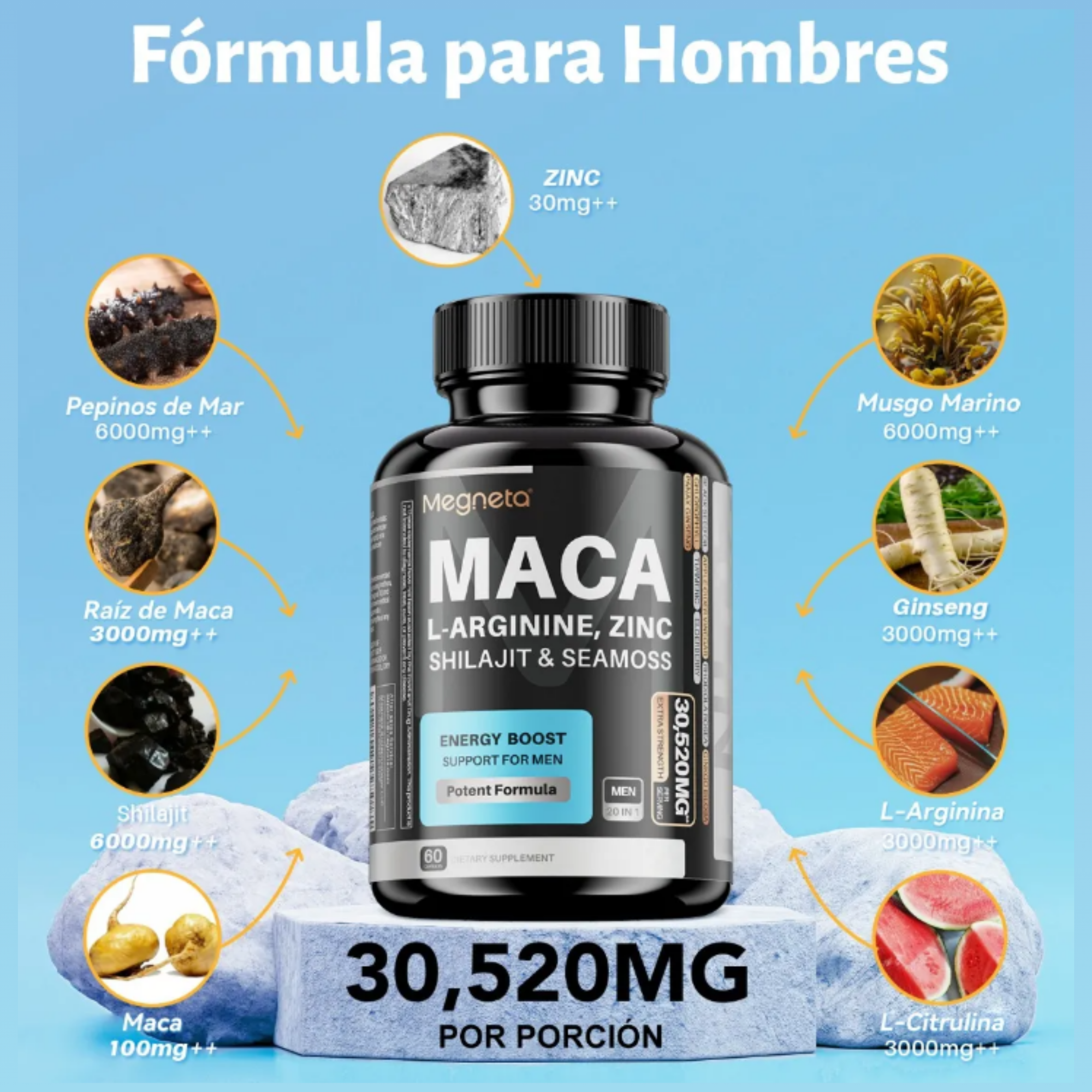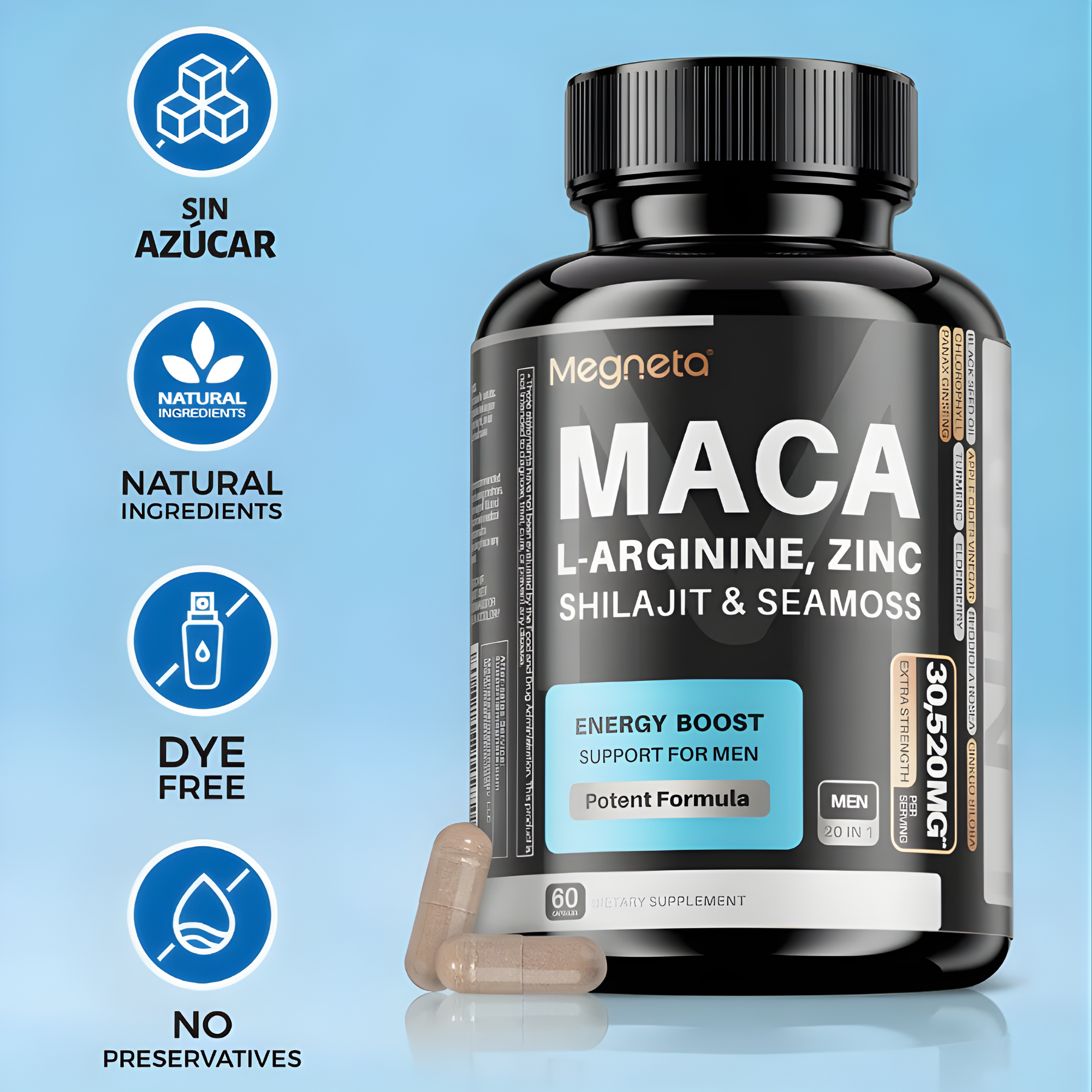 Megneta Suplemento para Hombres es una fórmula compuesta por extractos concentrados de origen natural en presentación de cápsulas vegetales.