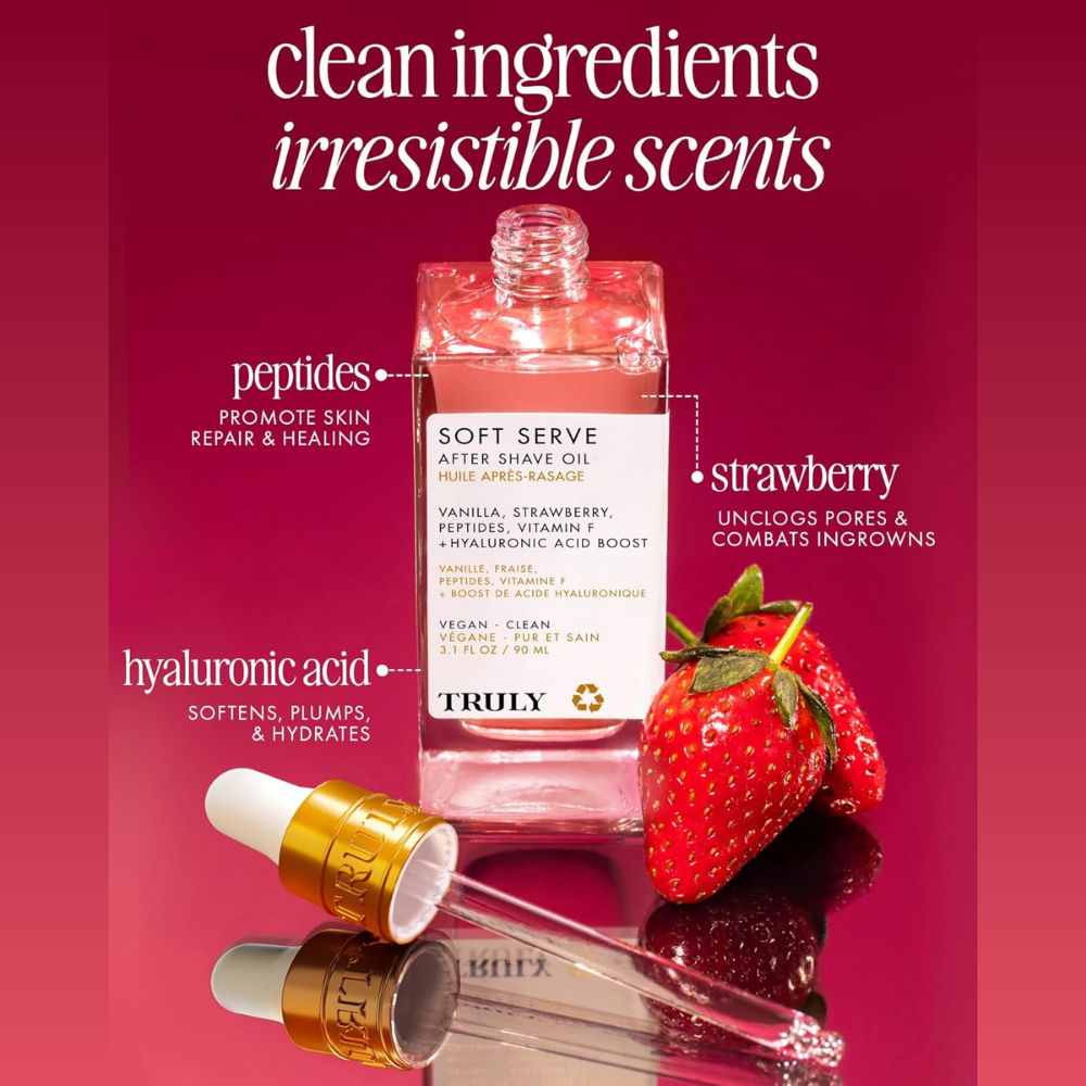 Un aceite calmante para después del afeitado formulado con péptidos, ácido hialurónico y fresa para hidratar, curar y prevenir quemaduras de maquinilla de afeitar y encarnaciones, dejando la piel suave, lisa y libre de irritación.